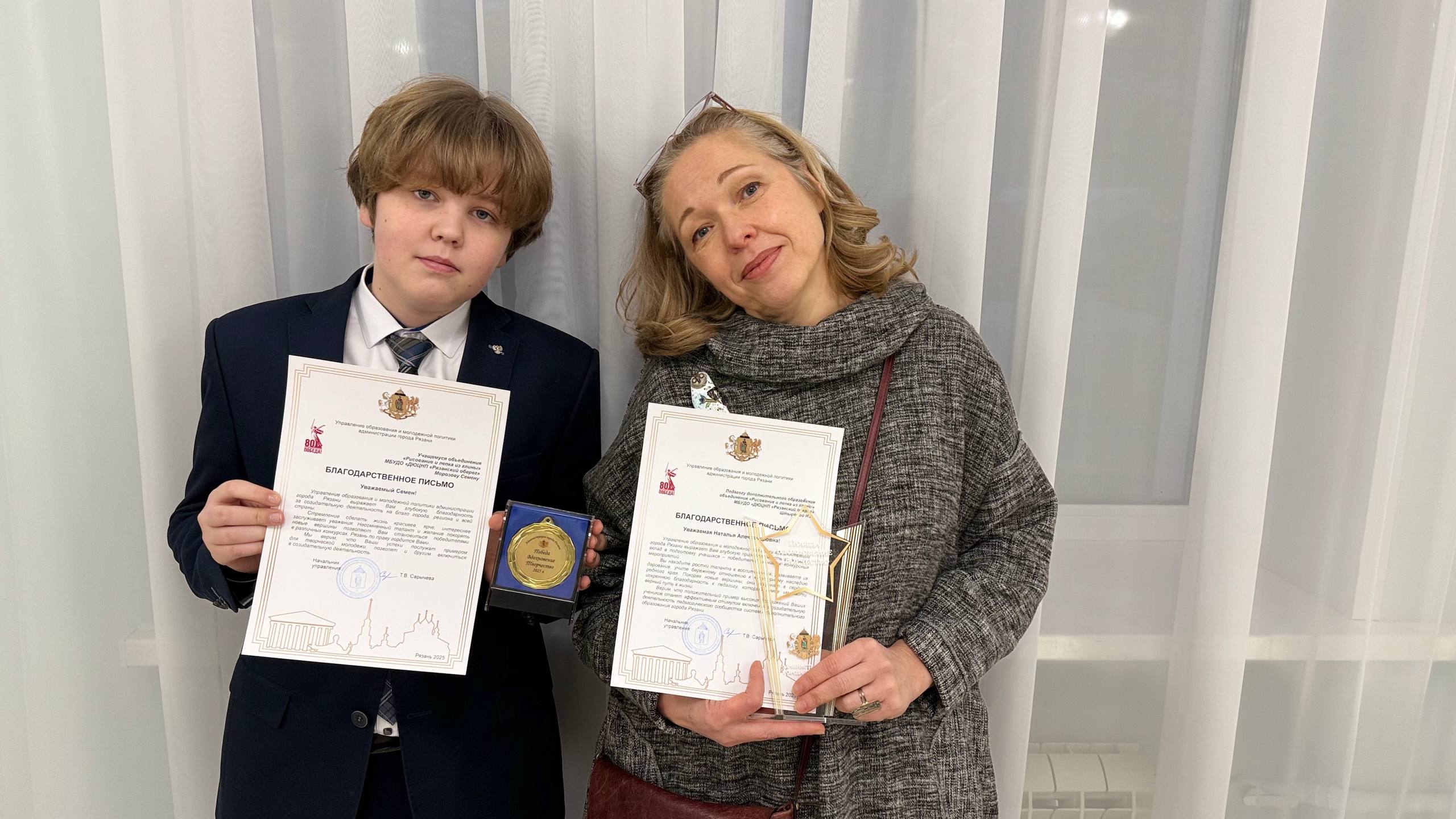 15 декабря 2025 года в МАУДО «Рязанский городской Дворец детского творчества» состоялось торжественное чествование учащихся и творческих коллективов учреждения дополнительного образования города Рязани - победителей особо значимых мероприятий Всероссийского и Международного уровней за 2024-2025 учебный год. Благодарственными письмами управления образования и молодёжной политики администрации города Рязани и памятными медалями и кубками были награждены учащийся объединения "Рисование и лепка из глины" Морозов Семён и его педагог Штырёва Наталья Александровна.